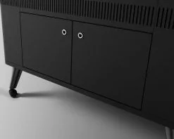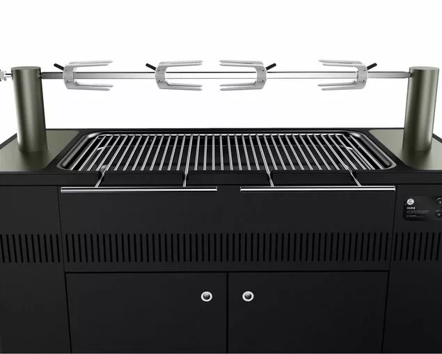 Built-in rotisserie system is powered by a discrete motor, with multi-level height adjustment and 40kg capacity. Includes 4 Cliplock Forks with compact internal storage.