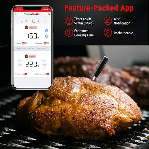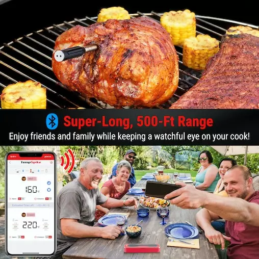ThermoPro TempSpike Bluetooth grill thermometer monitors your cooking from 500 feet by using the most stable radio frequency available on the market. Equipped with a pair of advanced heat sensors, this digital meat thermometer can track cooking temperatures both inside & outside your food. Enjoy 100% wire-free cooking and the convenience of no-hassle setup! As the smart choice that edges out the competition, it is a must-have for ovens, grills, sous vide, BBQs, smokers, rotisseries, and more!